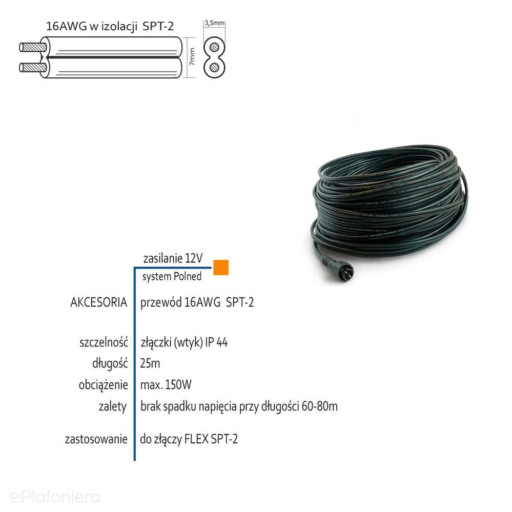 Przewód 16AWG ma wymiary 7mm x 3,5mm i znajduje się pomiędzy kablami SPT-1W i SPT-3W. Jest w pełni kompatybilny z całą gamą lamp, transformatorów i akcesoriów dostępnych w systemie 12V Polned.