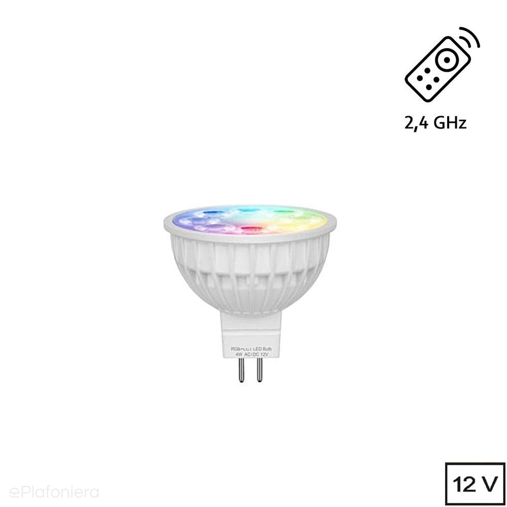 Inteligentna żarówka LED RGB+CCT RGB+WW+CW MR16 SMD 4W 12V AC/DC, to wielokolorowa żarówka LED z możliwością zmiany temperatury barwy białej 2700-6500K przy pomocy pilota radiowego lub modułu - mostka WiFi.