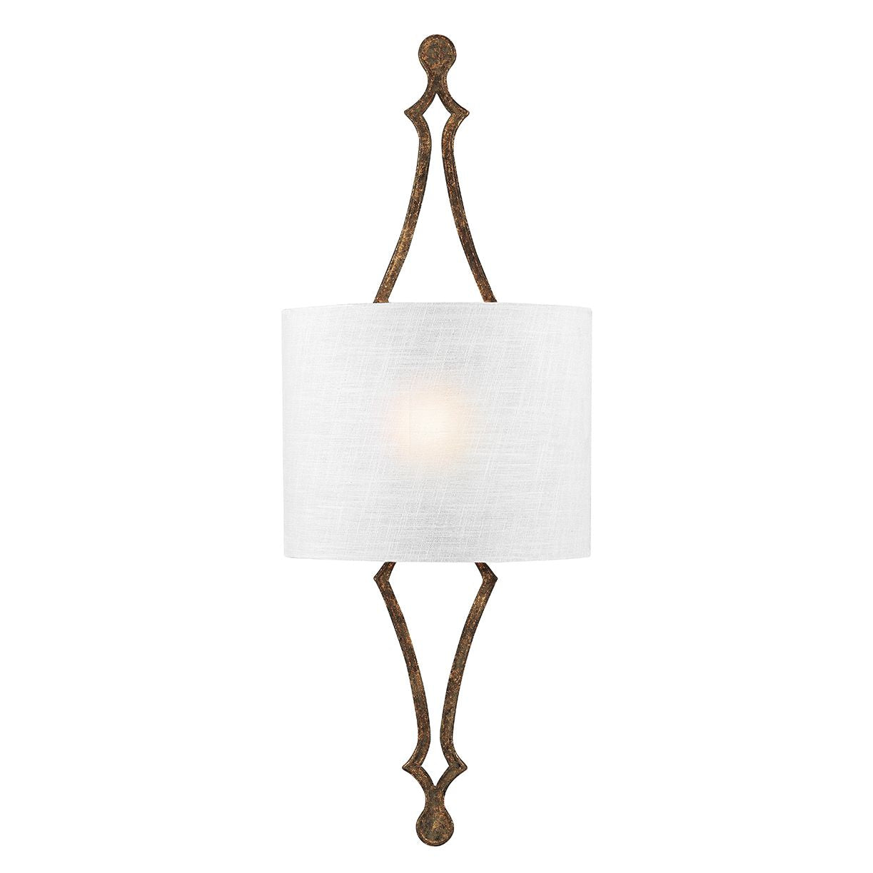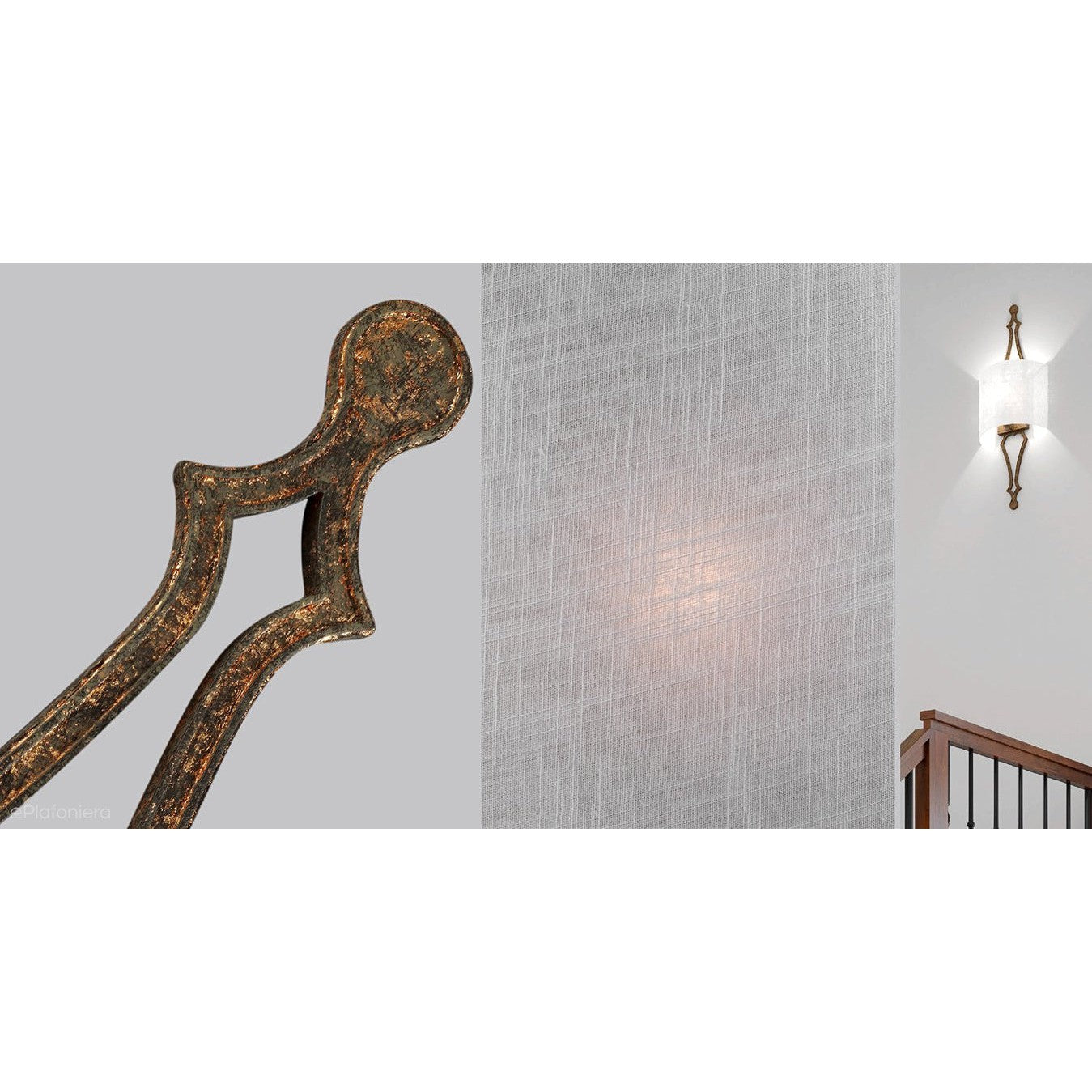 Romantyczny kinkiet, kunsztowna i bardzo dekoracyjna konstrukcja, jak ze starego żelaza, a na niej zawieszony jasny abażur wykonany z najwyższej jakości jedwabiu, o fakturze naturalnego lnu.