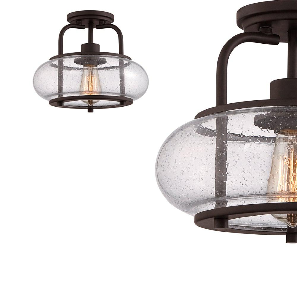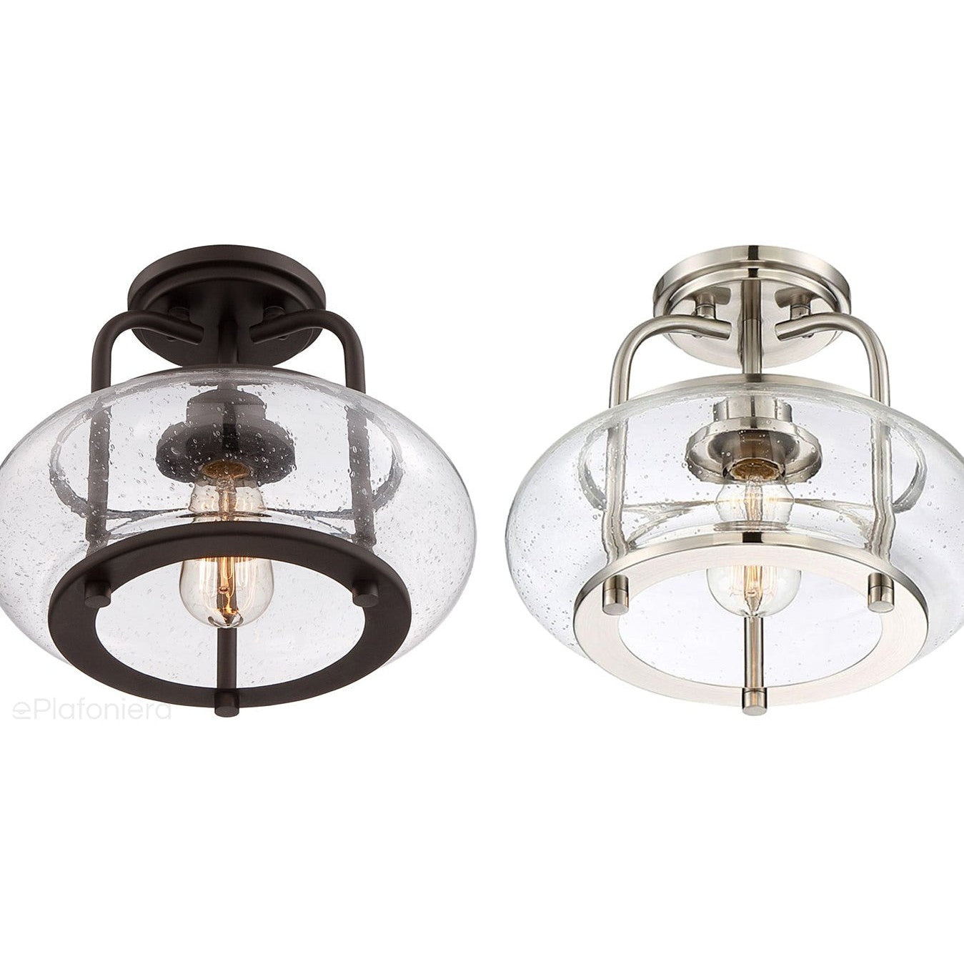 Nowoczesna plafoniera, elegancka, metalowa konstrukcja w kolorze starego brązu w połączeniu z dużym, okrągłym, otwartym kloszem z przezroczystego szkła bąbelkowego, na jedną widoczną żarówkę.
