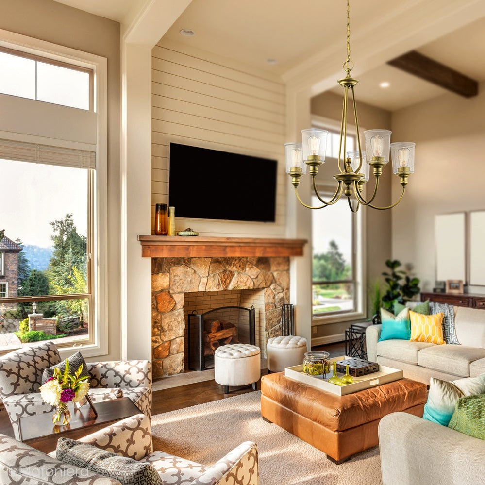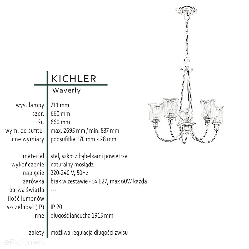 Lampa wisząca, żyrandol Waverly (naturalny mosiądz, 66cm) do salonu / sypialni - Kichler (5xE27)