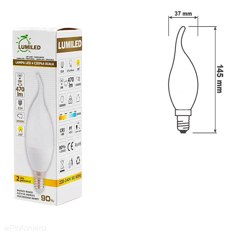 Żarówka ŚWIECZKA LED renomowanej marki LUMILED z trzonkiem E14 i mocy wynoszącej 5W (odpowiednik klasycznej lampy o mocy 50W) to wysokiej jakości źródło światła LED. Żarówka wykonana została przy użyciu nowoczesnych rozwiązań wykorzystujących innowacyjną technologię diod LED SMD 2835, które charakteryzują się wysoką wydajnością parametrów świetlnych, wiernym odwzorowaniem kolorów oświetlanych przedmiotów oraz wyjątkowo długą trwałością.