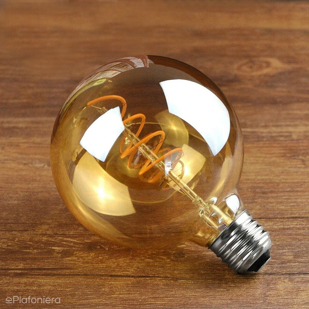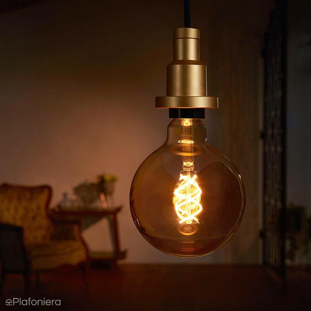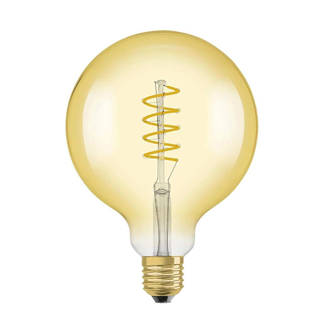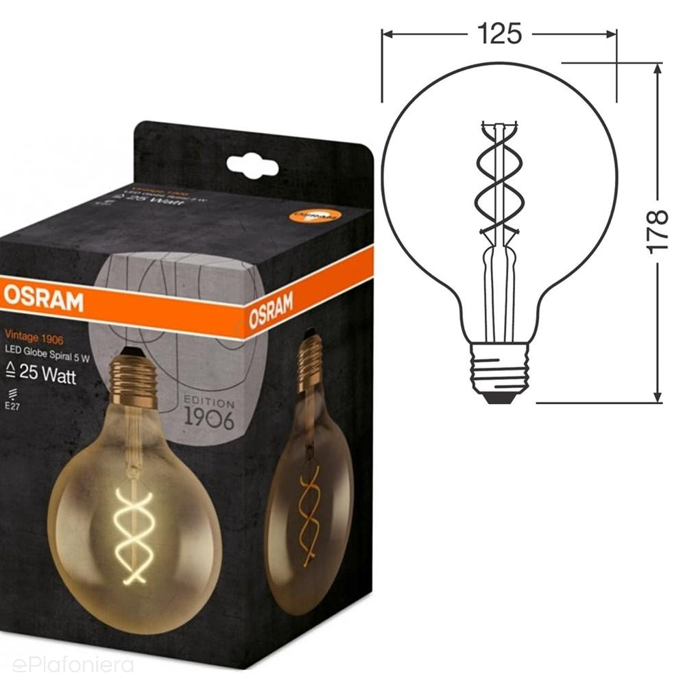 Żarówka LED Filament GLOBE GOLD SPIRAL z serii VINTAGE 1906 renomowanej i uznanej w branży oświetleniowej firmy OSRAM z trzonkiem E27 o mocy 5W = 25W (tradycyjnej żarówki) to ozdobne źródło światła cechujące się klasycznym kulistym kształtem G125. Jest to ciekawe połączenie dekoracyjnego stylu vintage z nowoczesnym wnętrzem. Dzięki swojemu nie przeciętnemu wyglądowi żarówka ta idealnie wkomponuje się w nasze wnętrza dodając im ciekawszego wyglądu i charakteru. Vintage 1906 może być montowane we wszystkie tradycyjne oprawy z gniazdem E27 co sprawia że wymiana starej żarówki na ten model jest banalnie prosta.