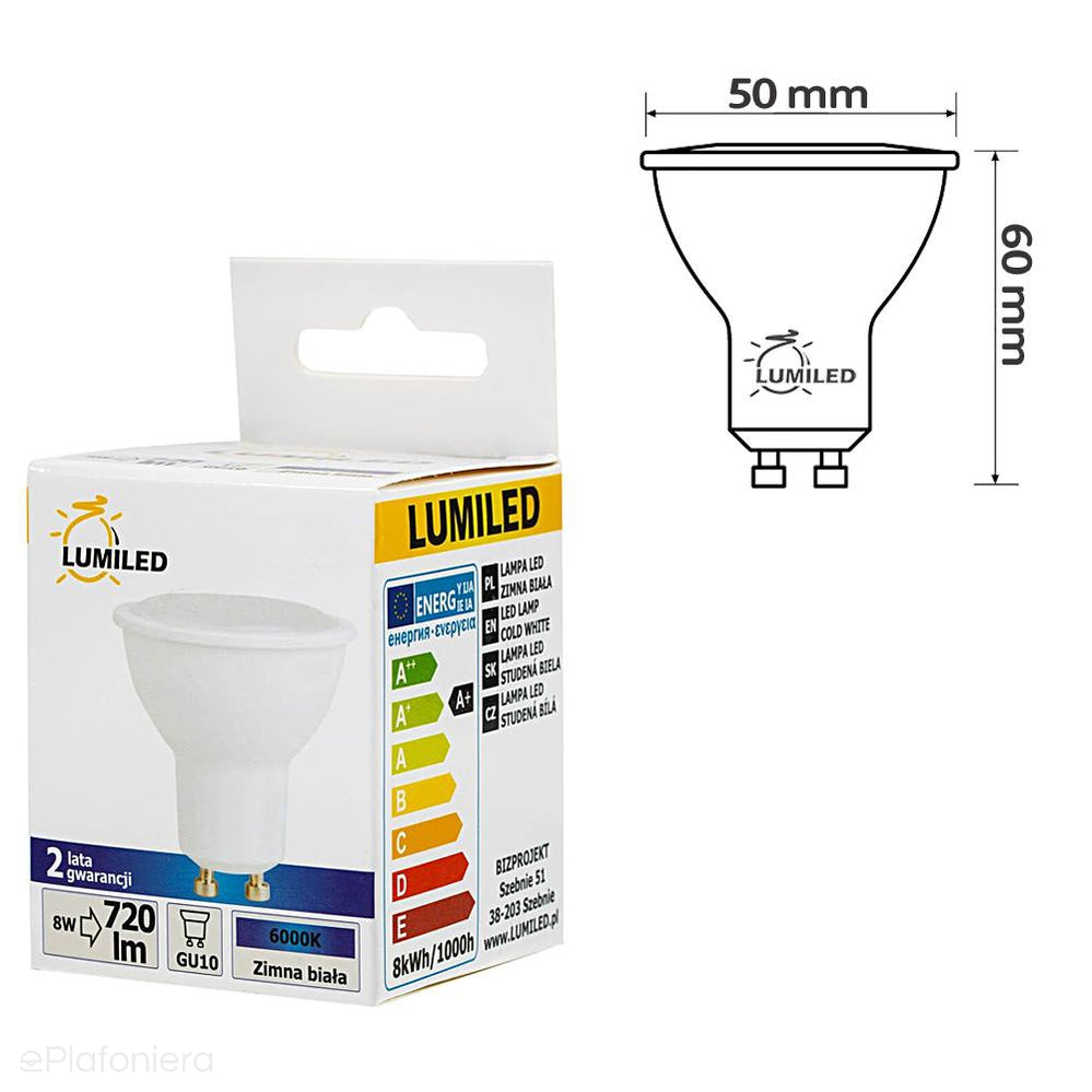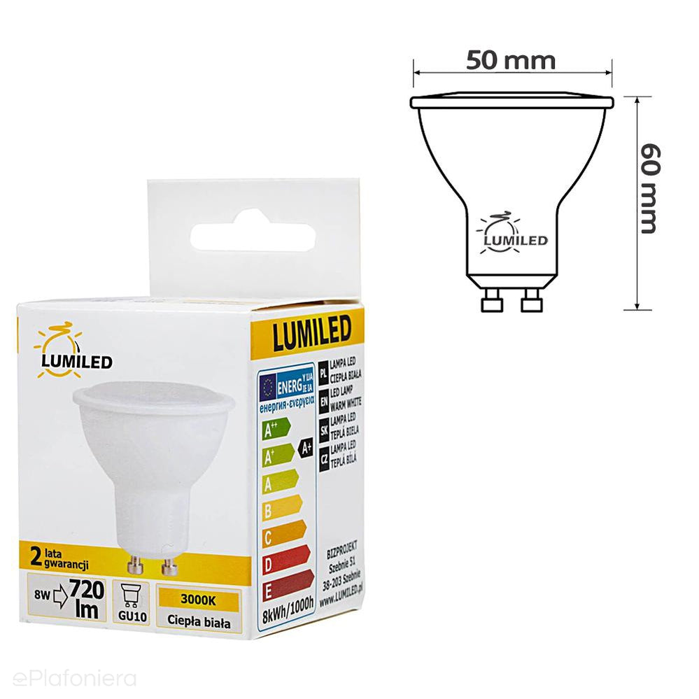 Żarówka HALOGEN LED renomowanej marki LUMILED z trzonkiem GU10 i mocy wynoszącej 8W (odpowiednik klasycznego halogenu o mocy 70W) to wysokiej jakości źródło światła LED. Reflektor wykonany został przy użyciu nowoczesnych rozwiązań wykorzystujących innowacyjną technologię diod LED, które charakteryzują się wysoką wydajnością parametrów świetlnych strumień świetlny: 720lm, wiernym odwzorowaniem kolorów CRI>80 oświetlanych przedmiotów oraz wyjątkowo długą trwałością 30000h.