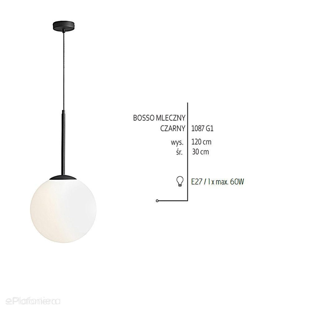 Nowoczesna, pojedyncza lampa wisząca, mleczny, satynowy klosz – kula zawieszona na kablu zakończonym metalową czarną rurką, z możliwością regulacji wysokości.