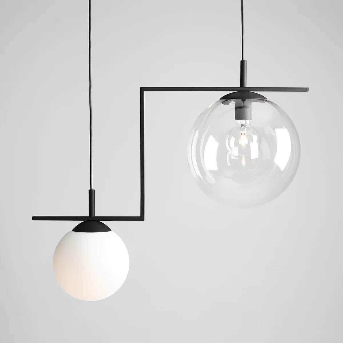 Nowoczesny, industrialny żyrandol, wiszący na dwóch przewodach, czarne ramię wygięte pod kątem prostym, do którego podwieszono szklane kule – klosze.