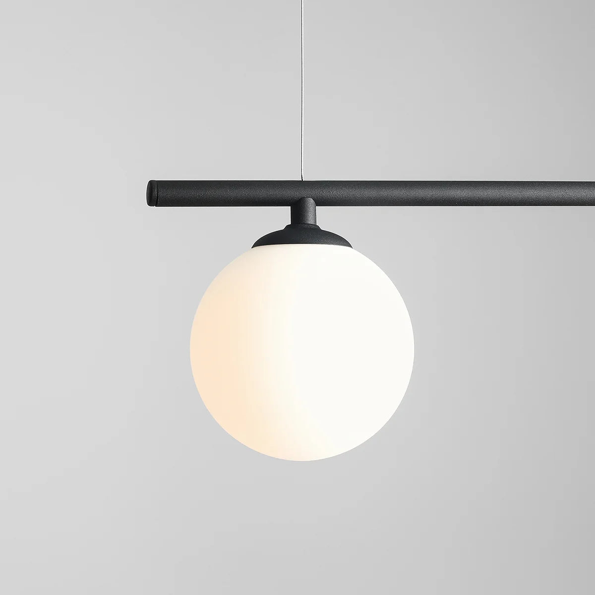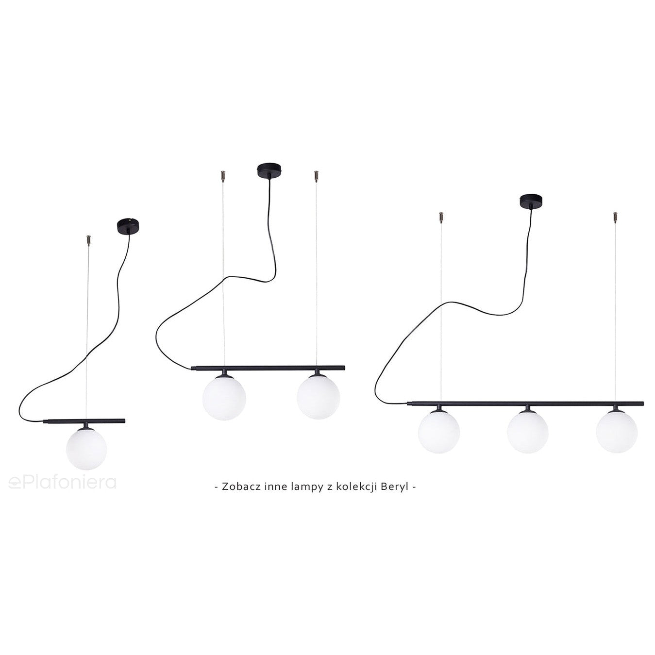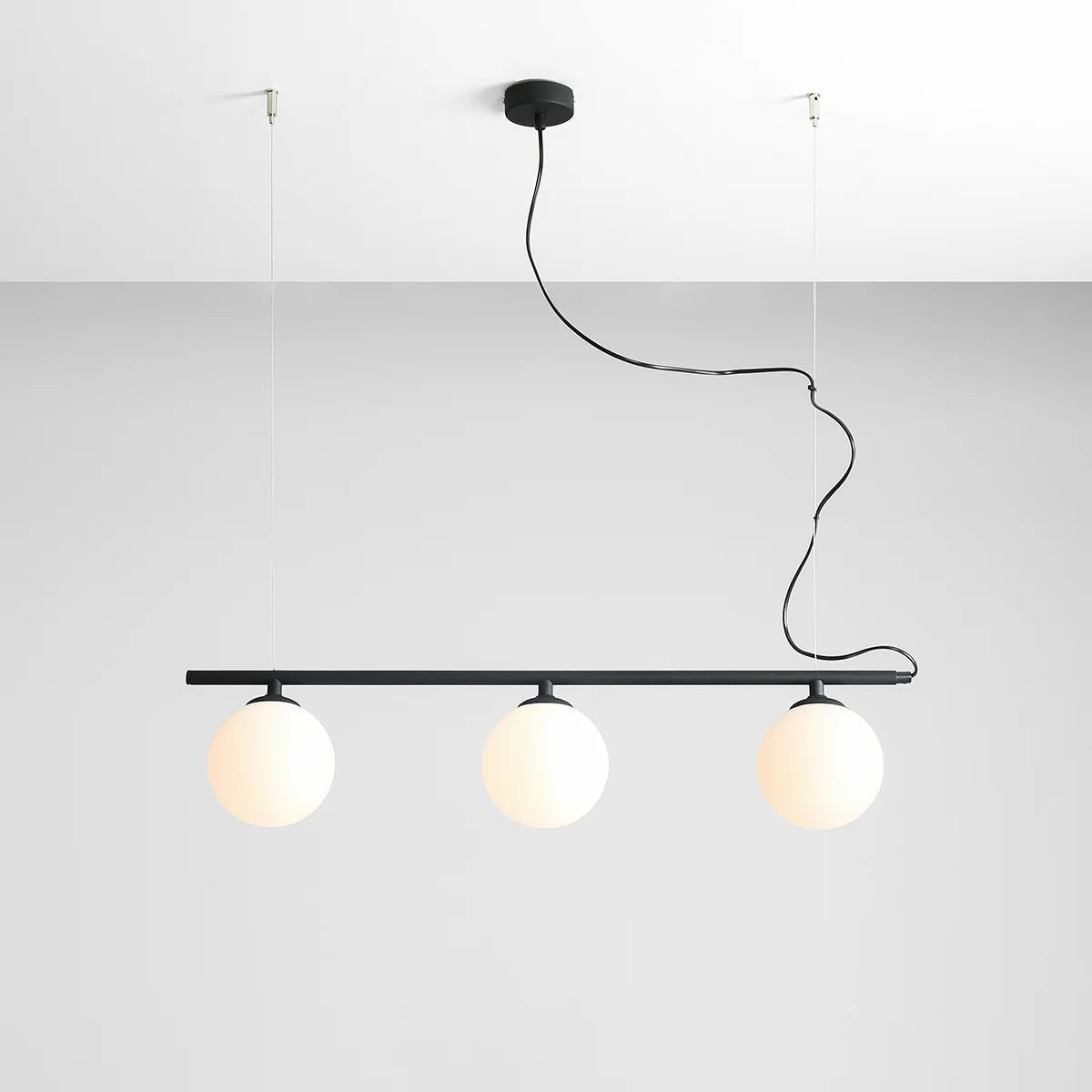Nowoczesny czarny żyrandol wiszący na lince, pozioma listwa z trzema mlecznymi kloszami.