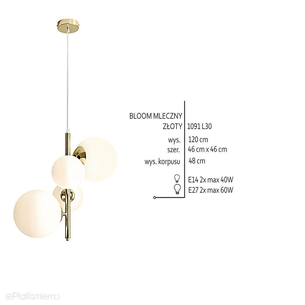 Nowoczesna lampa wisząca zawieszona na kablu z możliwością regulacji długości, zakończonym złotą metalową rurką, na której umieszczono cztery mleczne, satynowe klosze – kule o średnicy 14cm i 20cm.