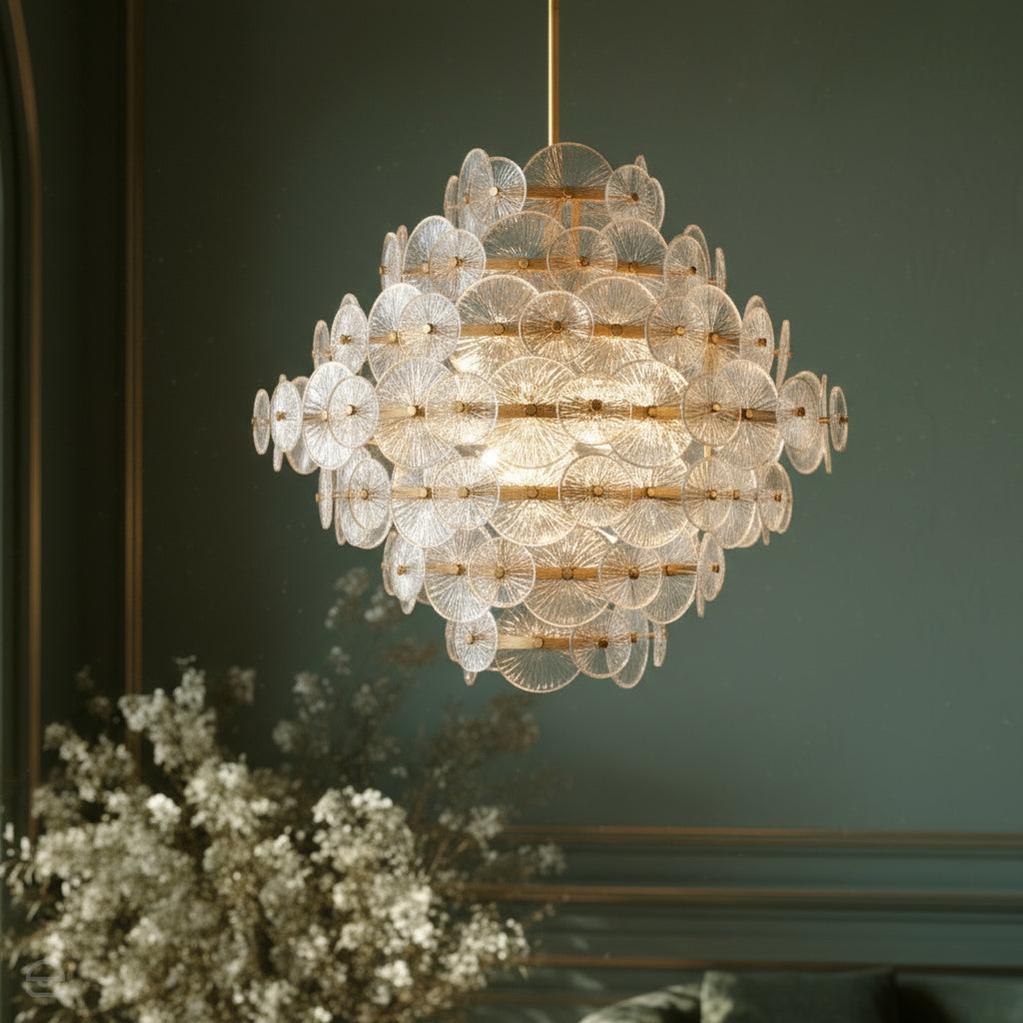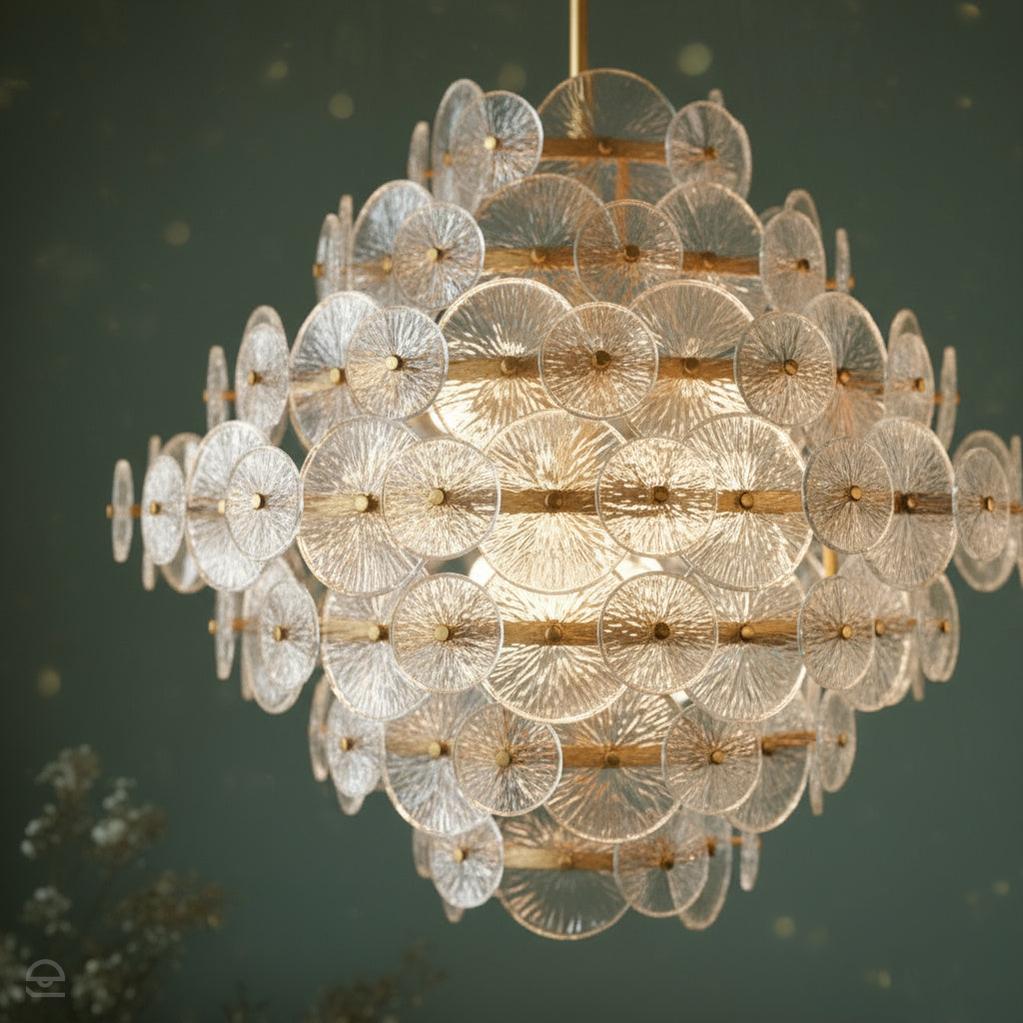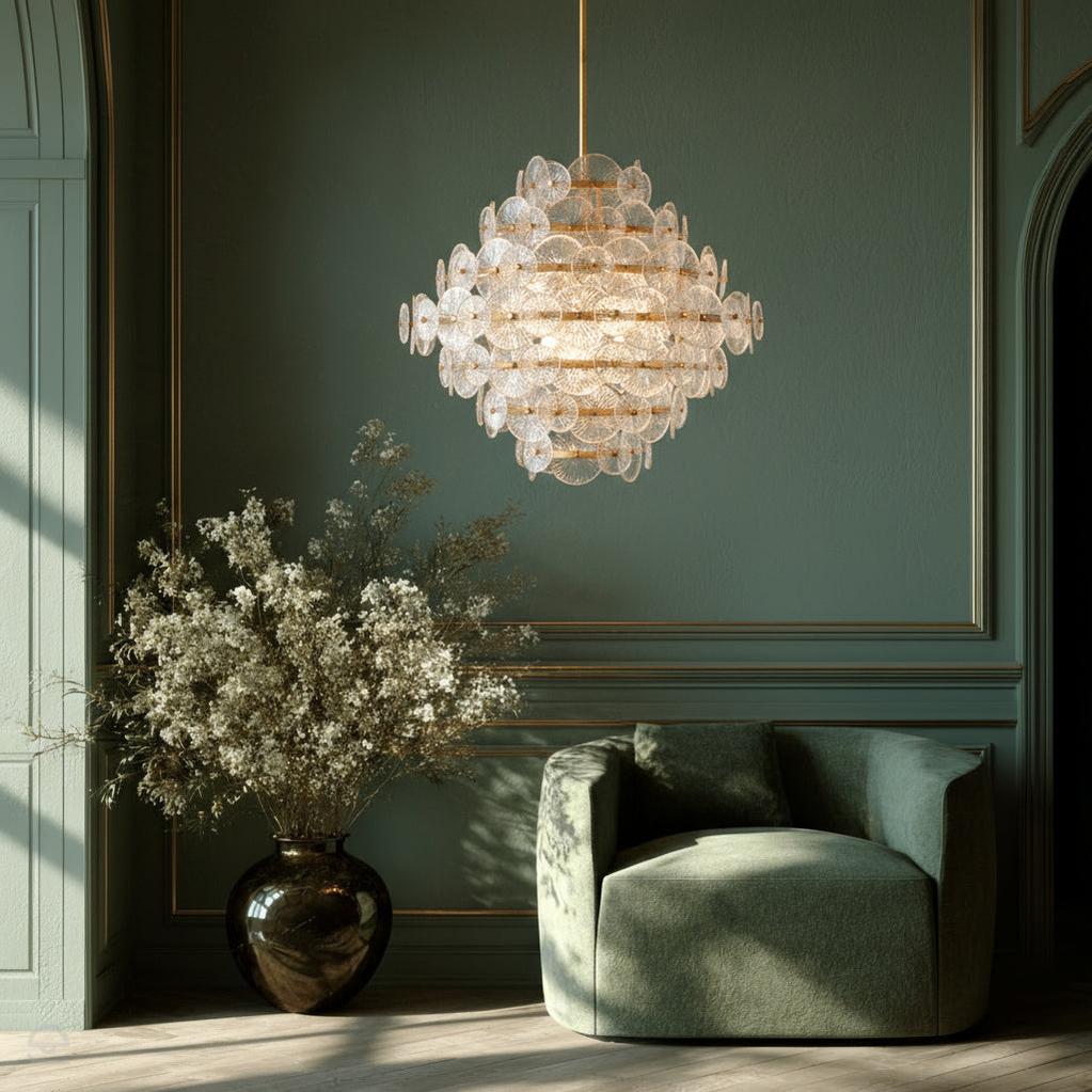 Żyrandol Rene z 16 źródłami światła w wykończeniu przecierany mosiądz to dekoracyjna i pełna blasku forma, która tworzy spektakularny efekt w przestrzeniach z wysokim sufitem. Konstrukcja opiera się na kilku warstwach tłoczonych, szklanych dysków, które odbijają światło niczym szlifowane kryształy. Elegancki stelaż w ciepłym, złotym odcieniu dopełnia całości, łącząc wpływy stylu glamour i klasycznego modernizmu.